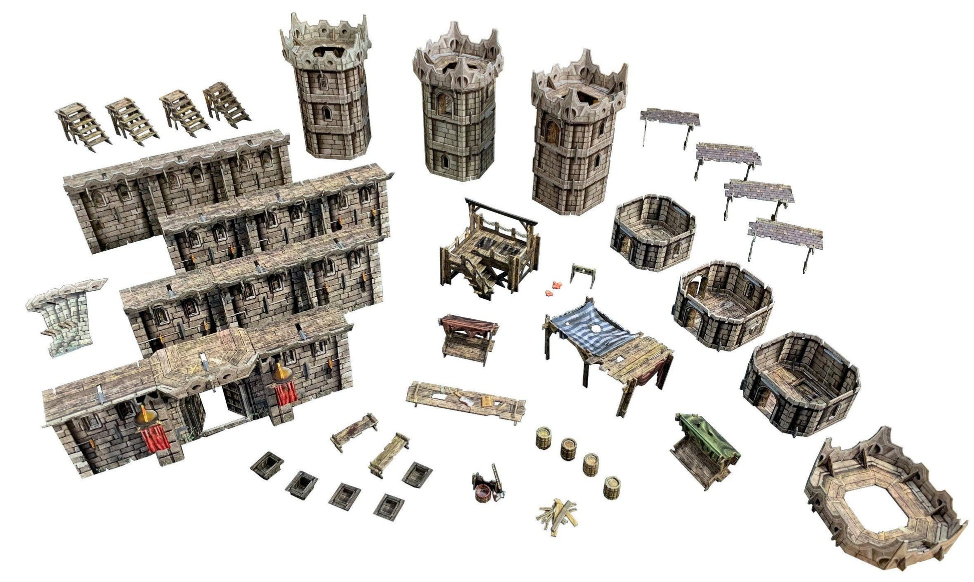 This box contains all the terrain you need for a complete gaming table built in or around a mighty castle, suitable for many 28-35mm fantasy and historical games. You can use the castle walls to surround a small skirmish board or build a longer fortification across a larger table. Many of the pieces are modular and can be assembled in any combination you choose for a different set-up every time. The roofs are removable and the buildings have fully detailed interiors.